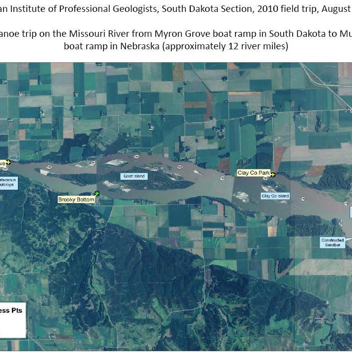 The field trip was conducted on a section of the Missouri River. It was attended by 23 people and included 14 kayaks and 4 canoes. The trip began at Myron Grove boat ramp on the South Dakota side and ended at the Mulberry Bend boat ramp on the Nebraska side. Derric Iles lead the float.