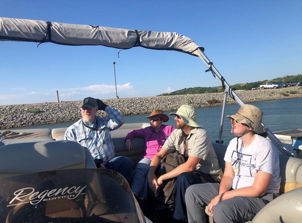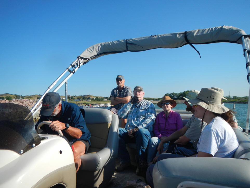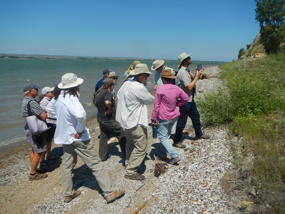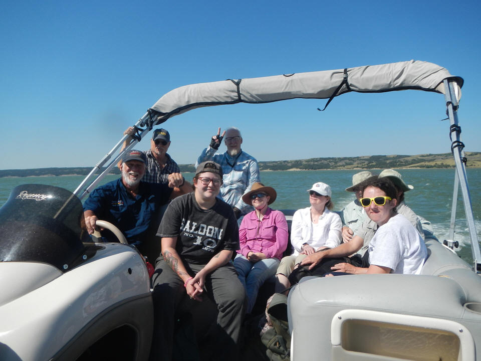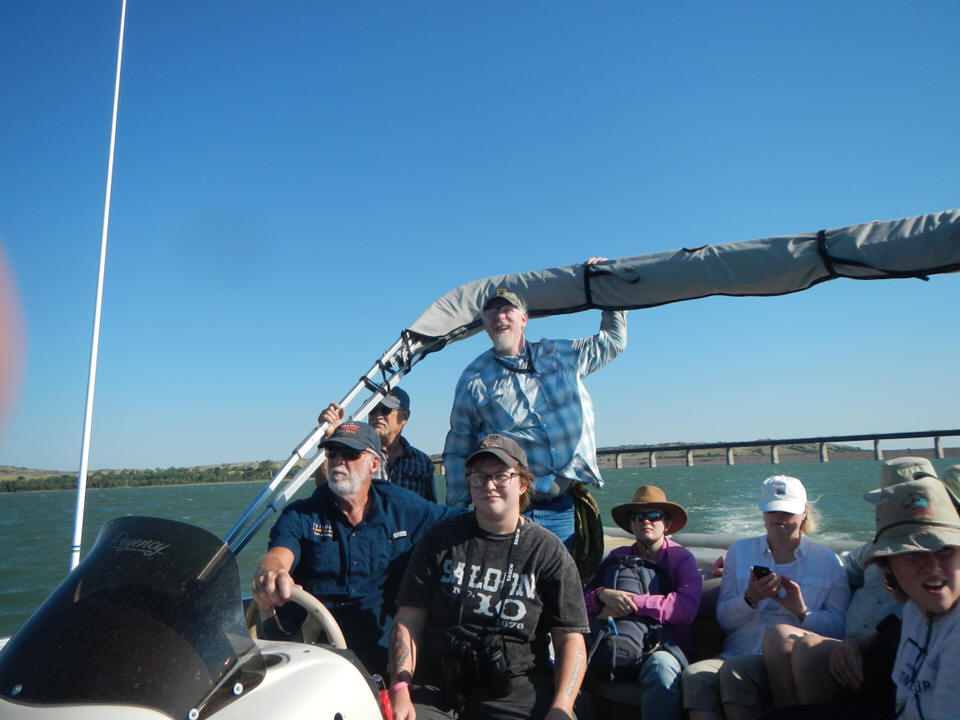 This field trip focused on Cretaceous stratigraphic units exposed along the Missouri River near Chamberlain, SD, along with their associated paleontological characteristics and taxa. The trip was led by Dr. Darrin Pagnac, Curator of Vertebrate Paleontology at the Museum of Geology at the South Dakota School of Mines & Technology. The trip was attended by 14 members and family/friends of the SD Section and consisted of a four-hour roundtrip pontoon ride from the Marina at Arrowwood Cedar Shore Resort & Conference Center in Oacoma, SD, to exposures of Cretaceous strata in the area as shown in the story map at: