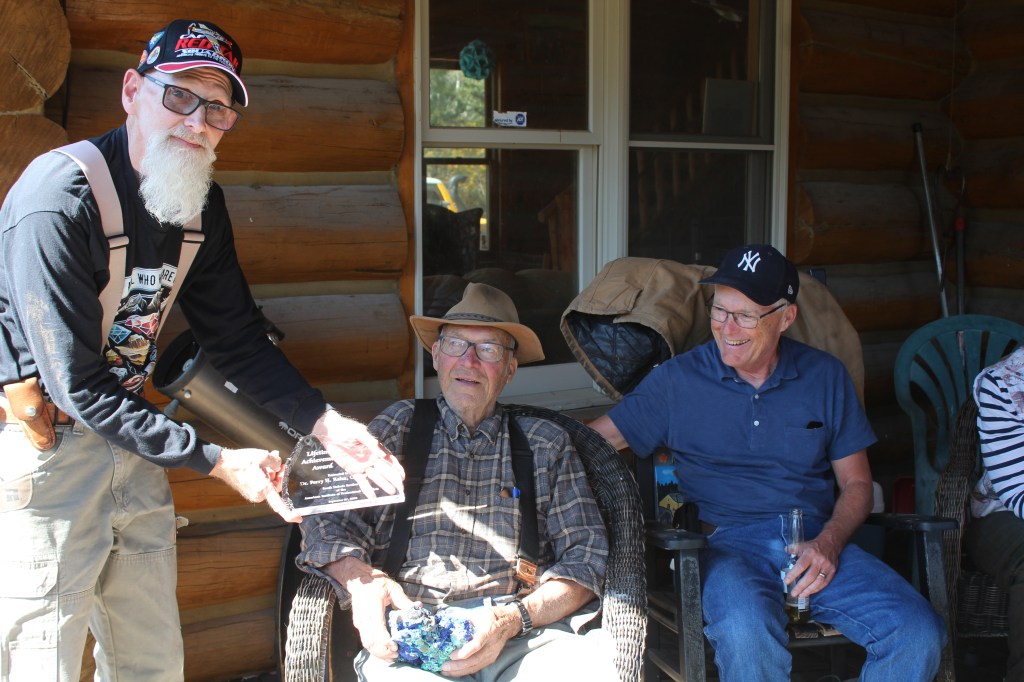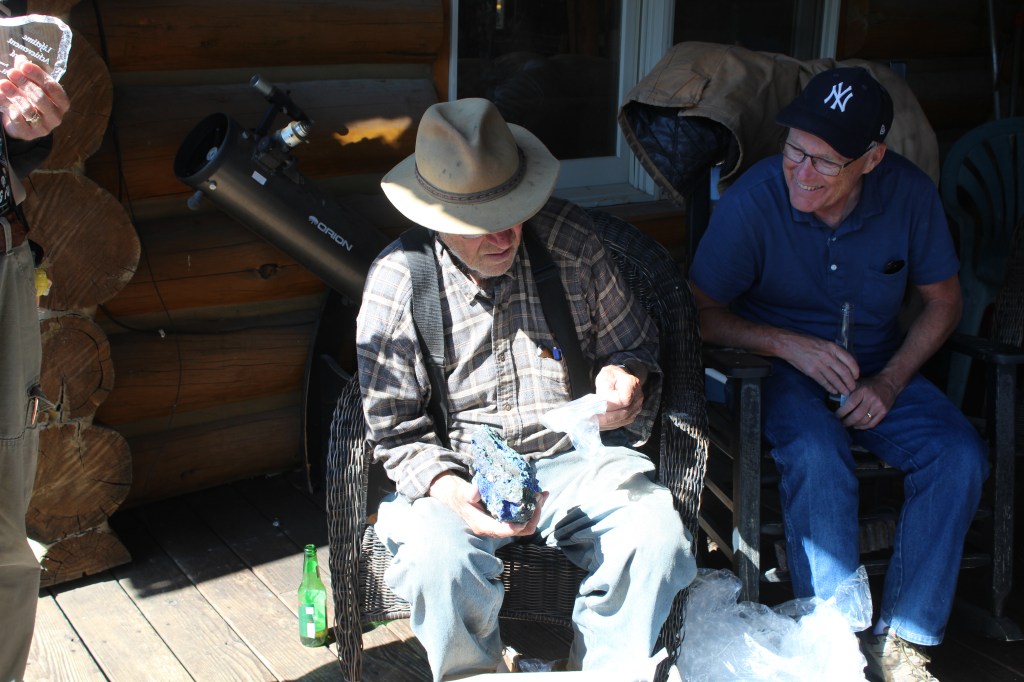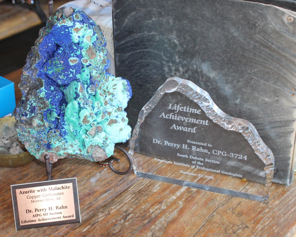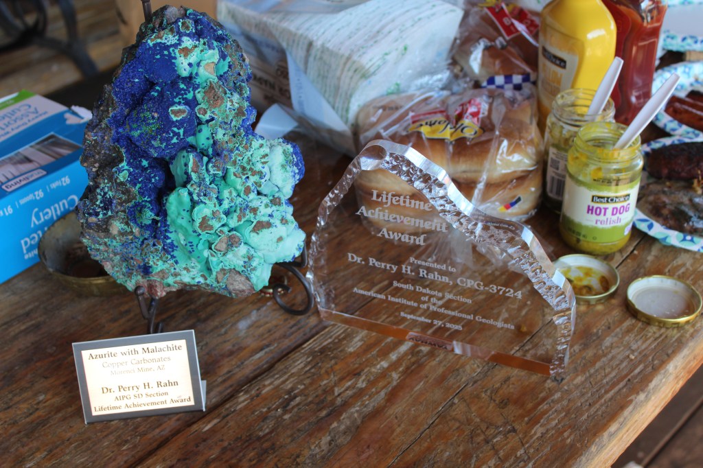 Dr. Rahn’s Lifetime Achievement Award included a beautiful specimen of azurite/malachite from the private collection of Tom Loomis of Dakota Matrix, as well as the glass plaque pictured above.